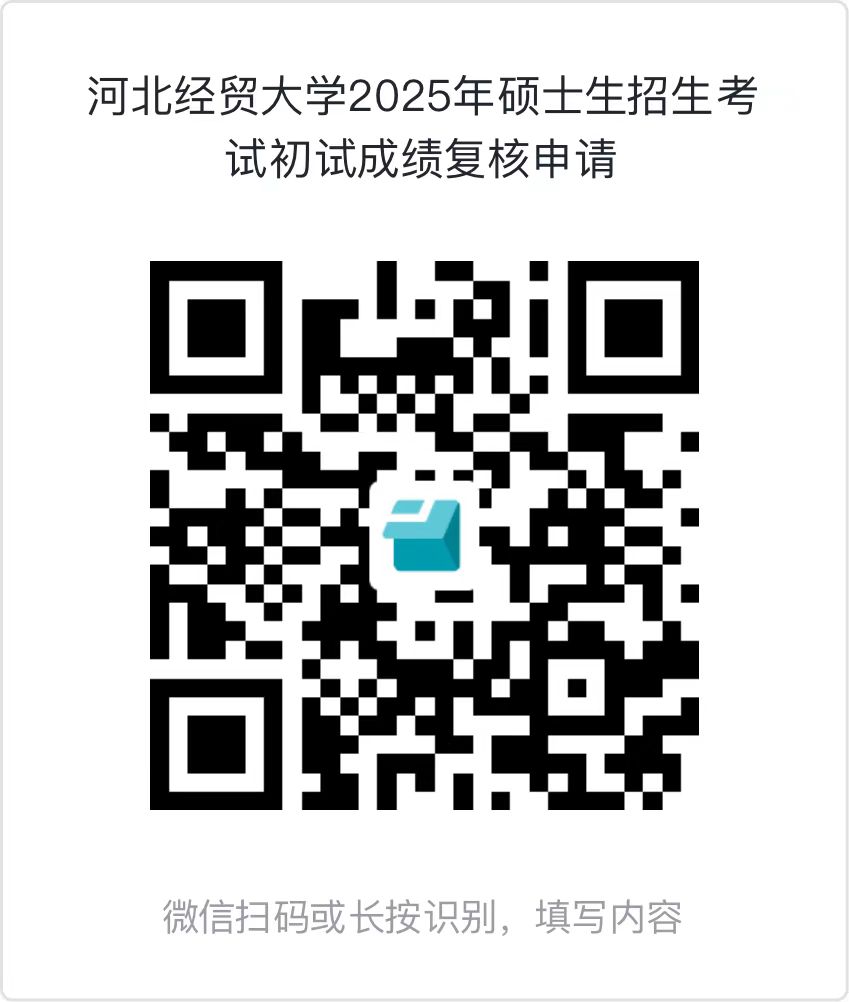2.微信扫描下方二维码,准确、完整填报考生编号(15位数字)、考生姓名、身份证号、复核科目、已查知成绩、申请复核理由、联系电话等相关信息,并按要求上传《2025年全国硕士研究生招生考试成绩复核申请表》等附件后提交。