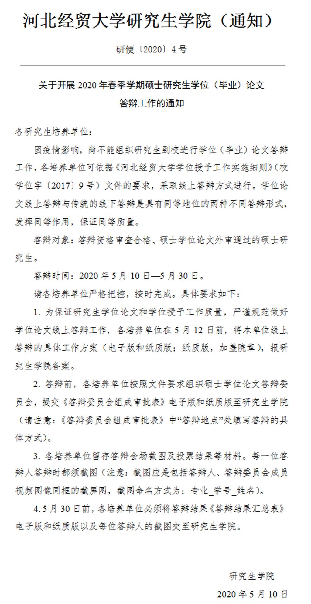 关于开展2020年春季学期硕士研究生学位(毕业)论文答辩工作的通知
